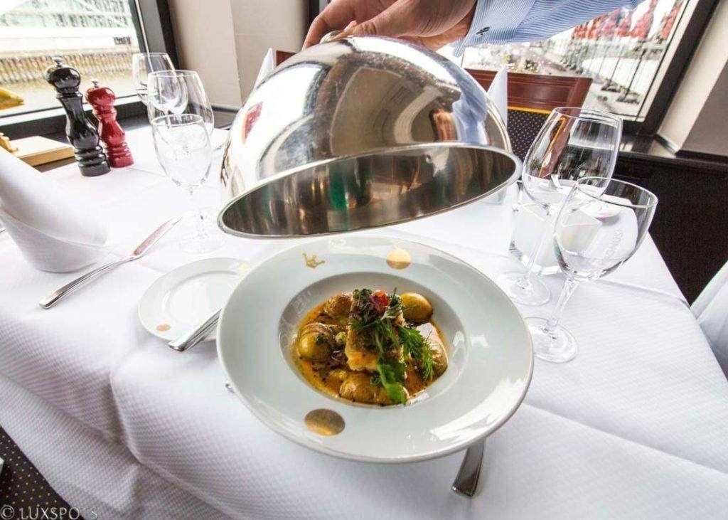 Als Vorspeise für Unentschlossene empfehlen wir den „Fischereihafen Teller“ für 22,50 Euro: Räucheraalfilet auf Kräuterrührei, Gamba im Knuspermantel, Spicy Tunatatar mit Ingwer, Heringshappen in Curry, Räucherlachs mit Apfelmeerrettich werden für das Auge geschmackvoll aneinander drapiert und fordern alle Geschmacksnerven gleichermaßen. Dass im Fischereihafen Restaurant modern gekocht wird, zeigt sich spätestens beim Hauptgericht: Wir entscheiden uns für ein „Filet vom Kabeljau in würzig-mediterranem Sud mit Rosmarinkartoffeln und Sauce Rouille“ (24,50 Euro). Passend hierzu lassen wir uns den klassischen Hauswein empfehlen, einen Grauburgunder vom Weingut Hilz, auf dem das Logo des Restaurants – eine Krone mit zwei Fischen – prangt. Abschließend bestellen wir uns zum Dessert einen „New York Cheesecake mit frischen Erdbeeren und Orangen-Joghurteis“ (11,50 Euro). Bei jedem Gang wird die Spannung durch eine traditionelle Cloche vergrößert, die vom Kellner in gewohnt professioneller Manier und kaum merklich vom Teller gehoben wird. Bon Appétit!