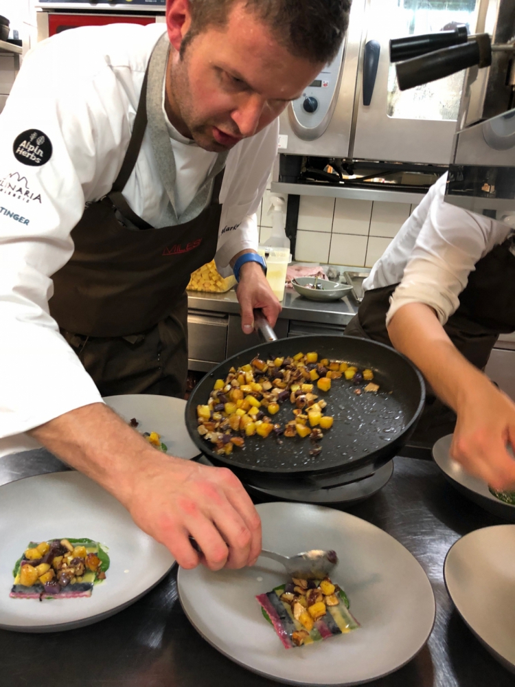 - Der aufstrebende Haubenkoch Lukas Gröfler bereitete am Gast sein Gericht vor