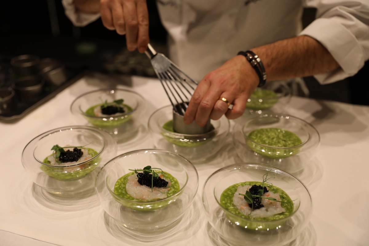 - Startfrei für Gang 2: Vorsichtig werden die Scampis mit dem Kaviar zusammen auf den grünen Risotto gehoben