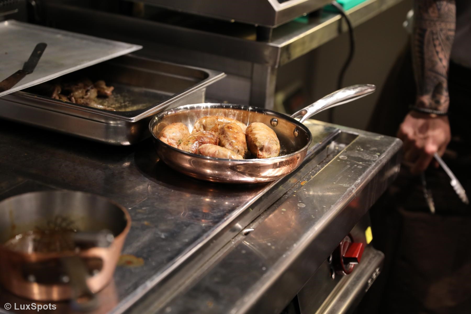 Nach einer kurzen Begrüßungsansprache durch Josef Mühlmann und Chris Oberhammer sind die Essstationen schließlich für das Publikum freigegeben. Die Gäste strömen durch die urigen Gänge und Zimmer im Erdgeschoss des traditionsreichen Gasthauses. Überall warten feine Köstlichkeiten auf ihre Entdeckung. Für Erläuterungen, was sich denn da nun auf dem Teller befindet, stehen ihre teilweise noch jungen, jedoch bereits ausgezeichneten Gastköche Rede und Antwort. Und es gibt an diesem Abend viel zu entdecken: Vom offenen Ravioli mit Steinpilzen, über einen Lamm-Lollipop mit Zammhonig bis hin zu einer Crème Brûlée vom „Boufl“. Traditionelle Gerichte werden hier teilweise neu interpretiert und zusammengestellt oder komplett neu kreiert. Eine Genussreise durch die österreichische und italienische Küche in mehreren Etappen von damals bis heute.